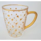 Essa caneca de vidro, de bolinhas e alça douradas, pintada a mão é um charme.
